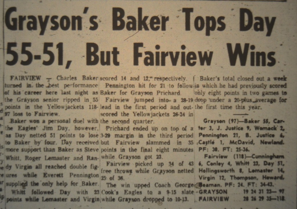 Grayson’s Charles Baker and Fairview’s Jim Day staged one of the greatest scoring duels in 16th Region history. Baker poured in 55 points. Day answered with 51. Fairview won, 118-97.