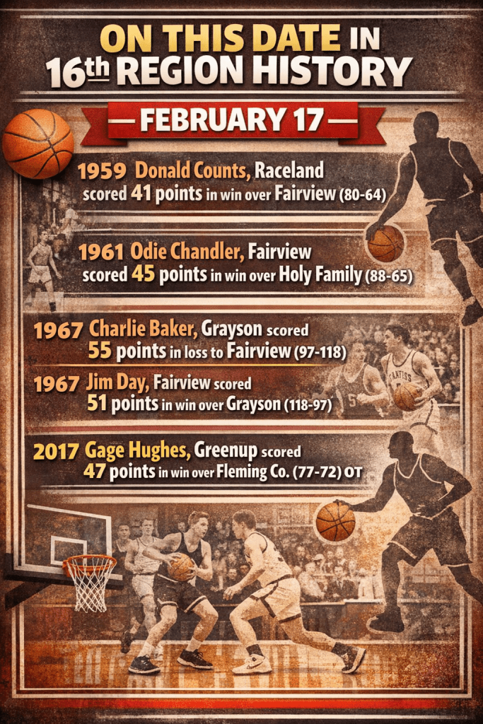 Curtis Crye, the 16th Region statistical guru, reminds us that February 17 is a night in area basketball history where points come out in bunches.