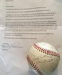Lauer became the owner of the baseball 48 years ago. Anybody who caught a foul ball could exchange it for one autographed by the Packers’ players.